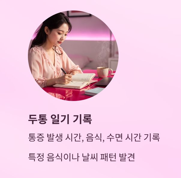 통증이 발생한 시간, 먹은 음식, 수면 시간 등을 기록해 보세요. 의외로 특정 음식(치즈, 레드와인, 가공육 등)이나 날씨 변화가 원인임을 발견할 수 있습니다.